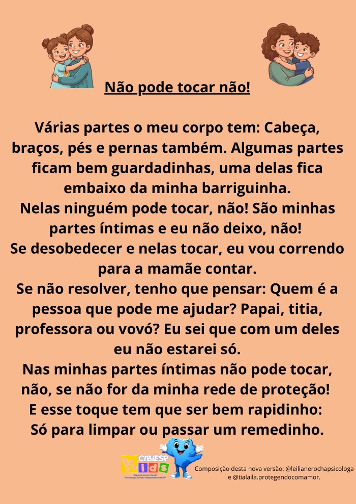 - 5. Toque físico com prudência: evitar qualquer contato físico desnecessário; qualquer cuidado deve ser feito com respeito, moderação, e sempre em ambiente visível e apropriado.